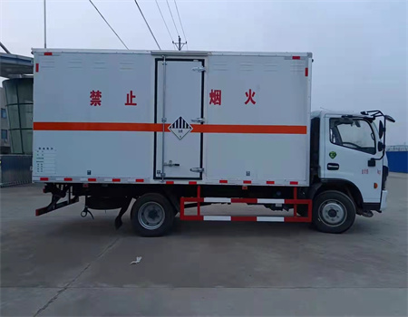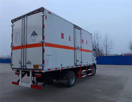 外板采用免漆板及一次性沖壓成型具有防雨功能的通風窗,貨廂內蒙皮采用合金板有透氣孔,復合加鉚合工藝,內襯為矩形管骨架牢靠穩(wěn)定,貨廂面板內外蒙皮之間采用阻燃隔熱材料填充。廂體外部四周鋁合金型材包邊,底板和車廂前下部鋪橡膠皮,后門雙開,可選開側門,內部裝固定貨物的臥環(huán)或護板,安裝煙霧報警器、防盜感應器。車身附件靜電接地帶、滅火器、防火罩、危險品三角燈、橙色反光帶、CCC反射器、菱形標志牌、危險品牌、安全告示齊全。